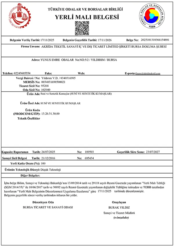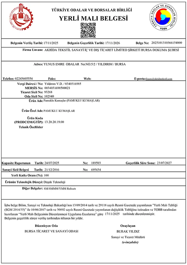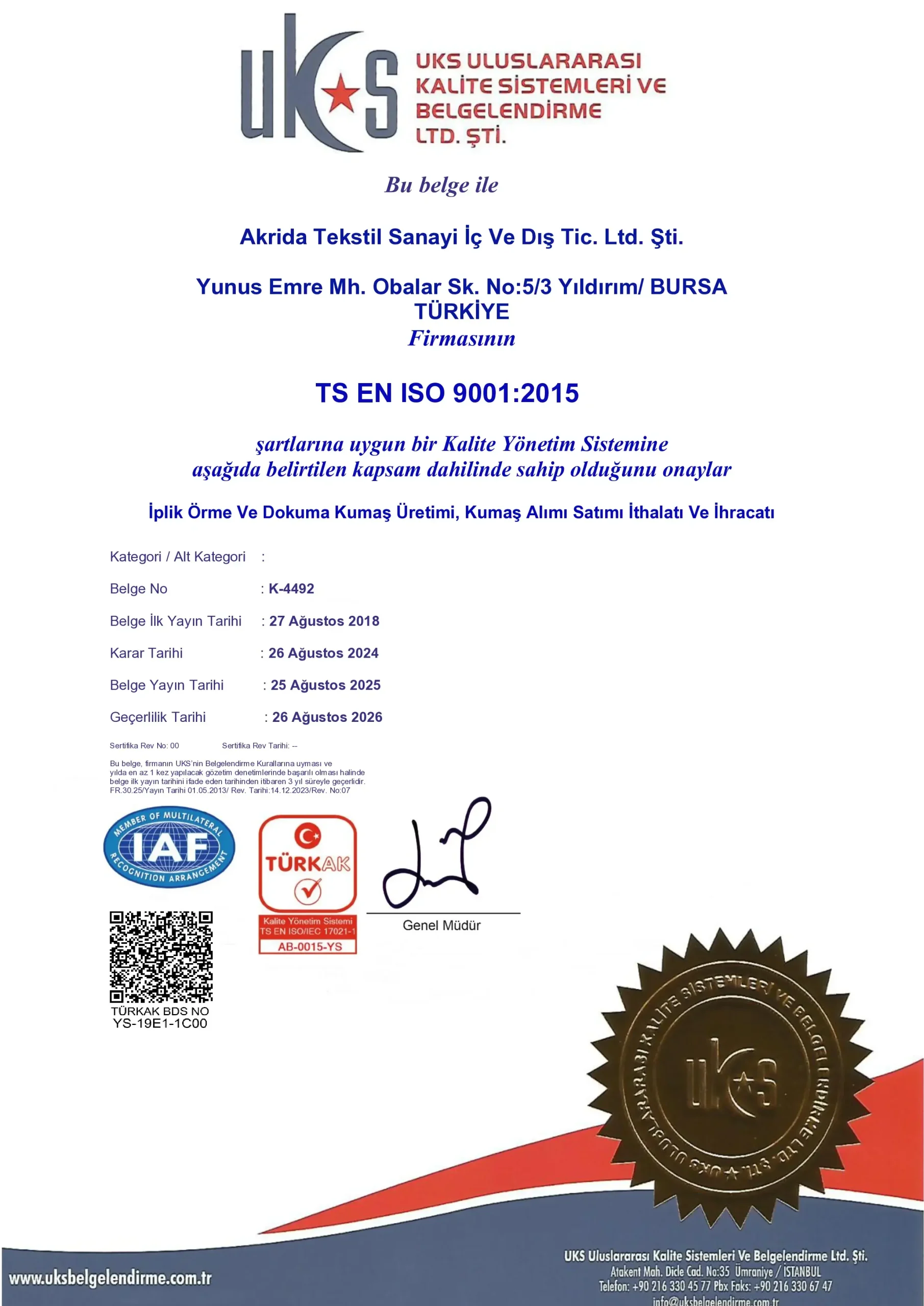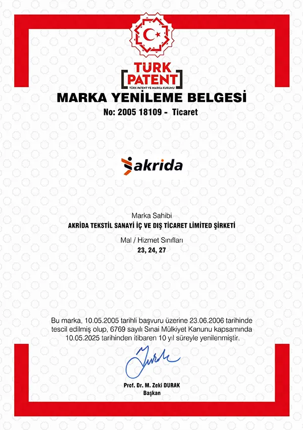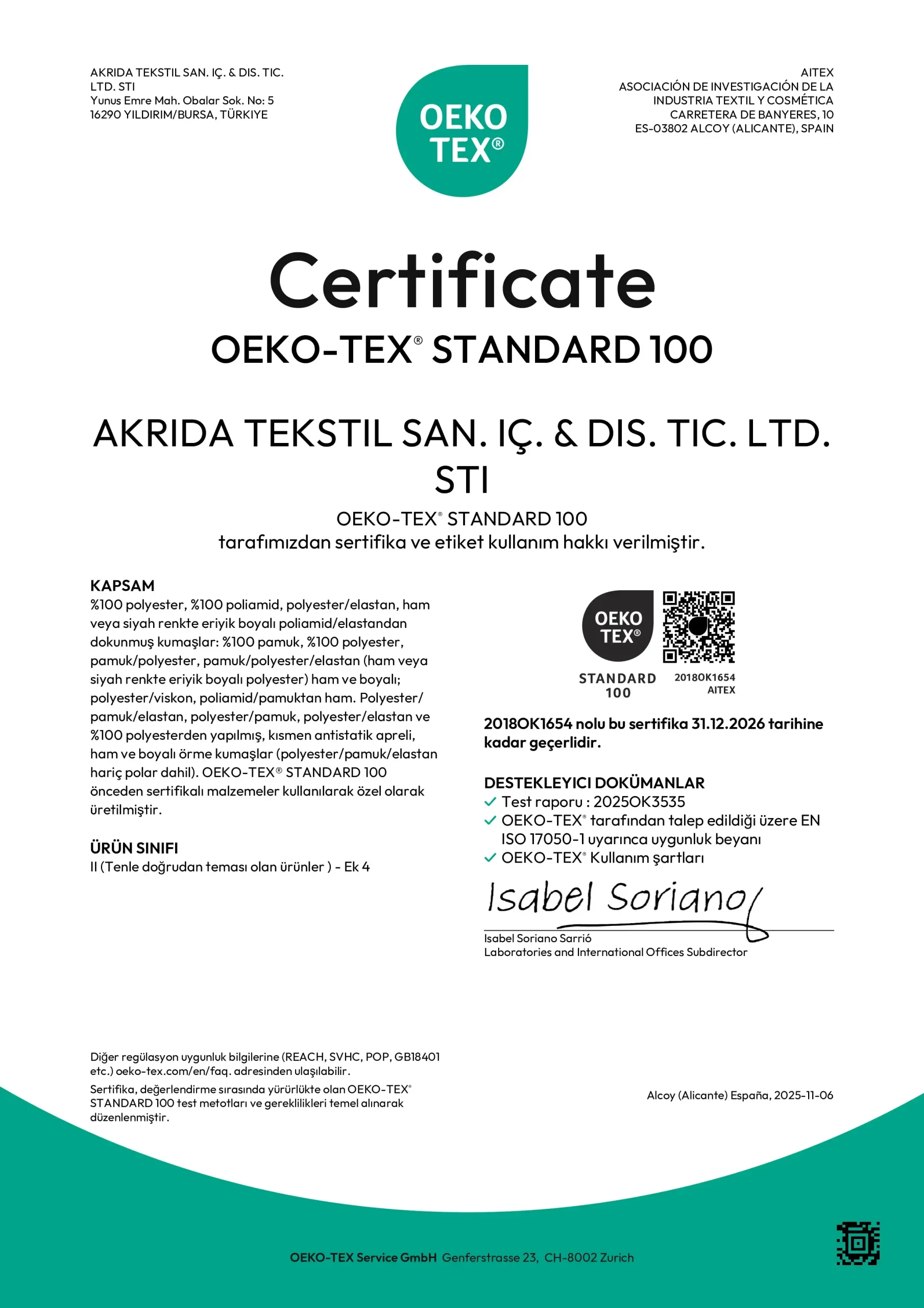 Belgelerimizin gereksinimlerini işlememizde titizlikle uygulayan firmayız. Gerek işletme gerek ürünlerimizin üst seviyede kaliteli ve çevre dostu olması ve sürdürülebilir kalması Akrida Tekstil’in her birimi sorumluluğu bilerek üretimine devam etmektedir.